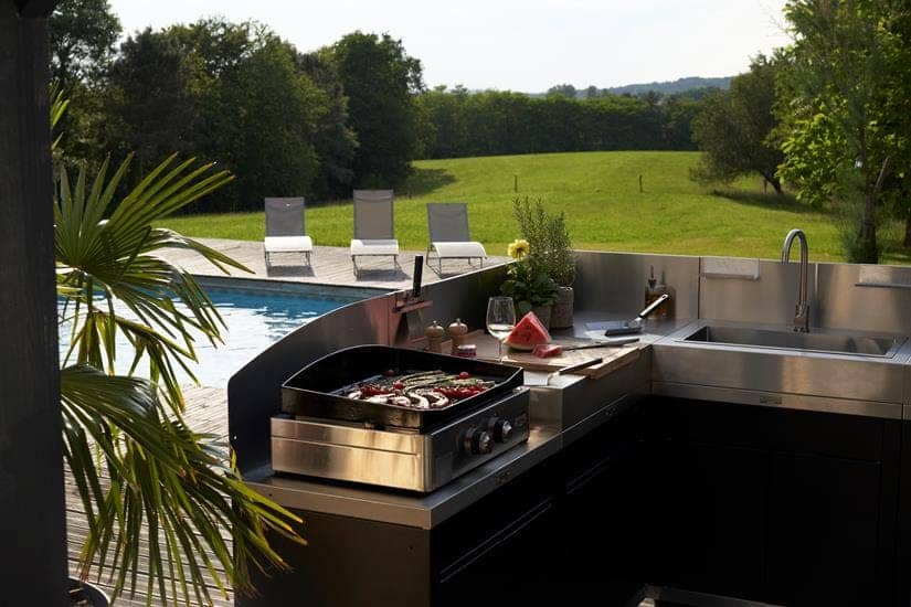 La Le Marquier Cucina Angolare 5 Elementi Top Inox con Credenze – Duo è una soluzione da esterno modulare e raffinata, progettata per chi desidera una cucina elegante, funzionale e altamente personalizzabile.