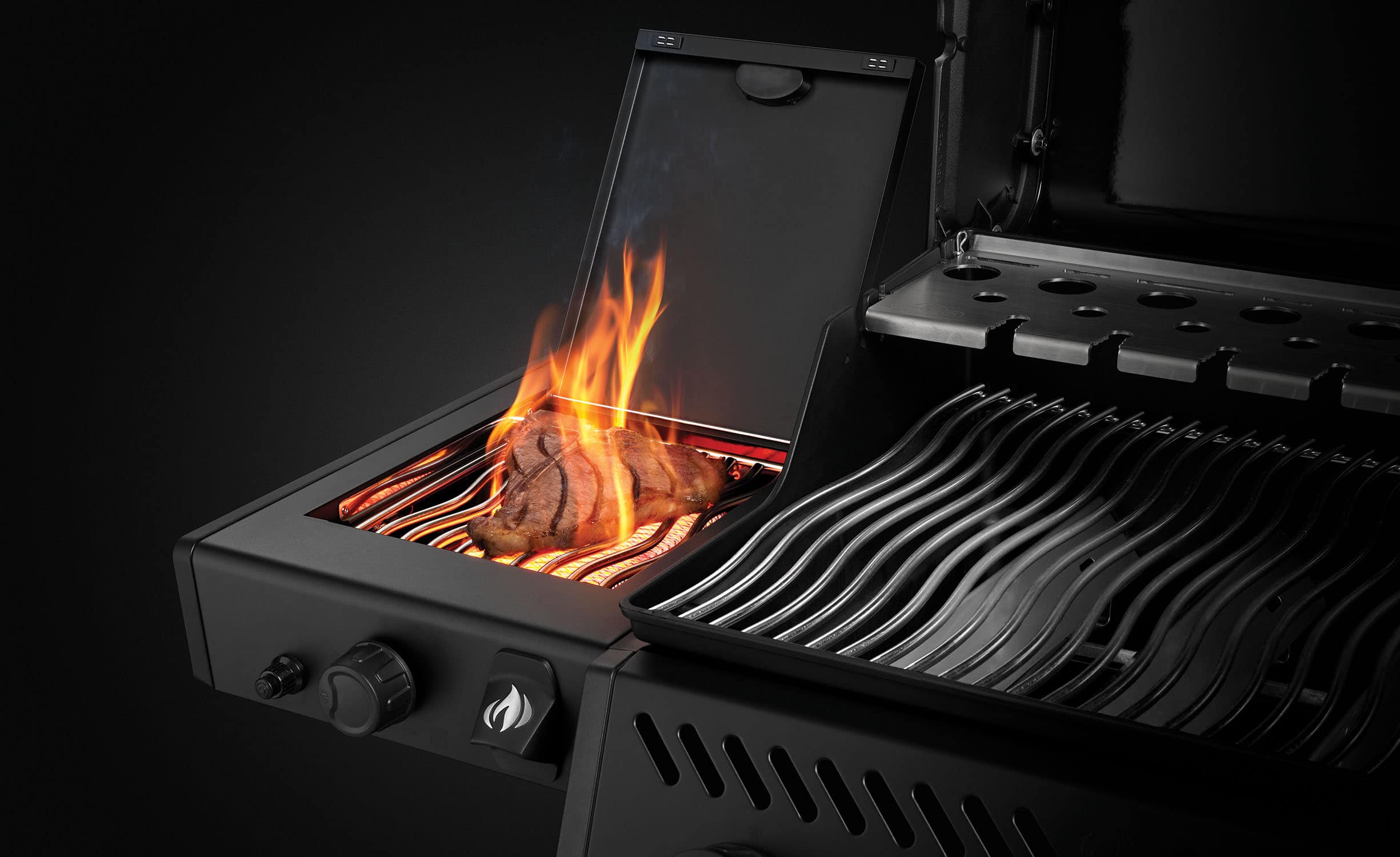 La vera peculiarità di questo barbecue è il bruciatore laterale SIZZLE ZONE a infrarossi, che consente di ottenere scottature da ristorante stellato o di preparare contorni e salse mentre si griglia sulla superficie principale. Il sistema di accensione JETFIRE garantisce l’accensione immediata e affidabile dei bruciatori attraverso un getto di fiamma, eliminando le incertezze della tradizionale piezoelettrica.