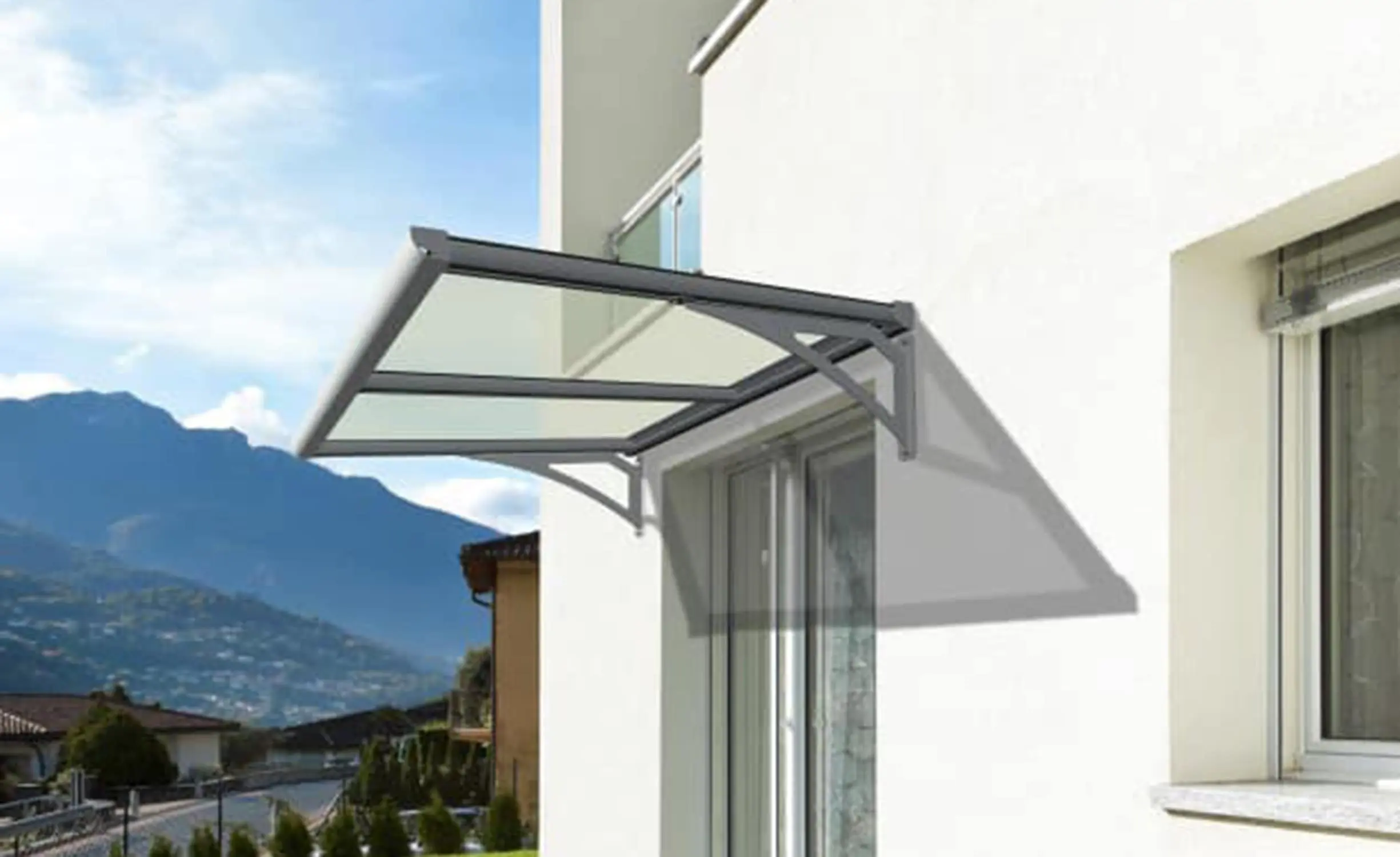 Pensilina piatta, costruita in alluminio e policarbonato. Il design piatto consente una maggiore flessibilità nell’utilizzo dello spazio sottostante.