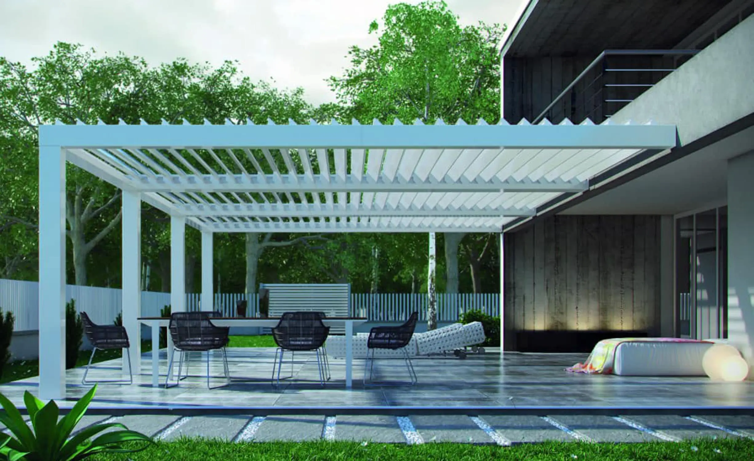 Pergola bioclimatica addossata a parete. Pergola a doghe orientabili. Il profilo risultante della pergola è completamente piatto, conferendo alla struttura un design ancora più moderno.