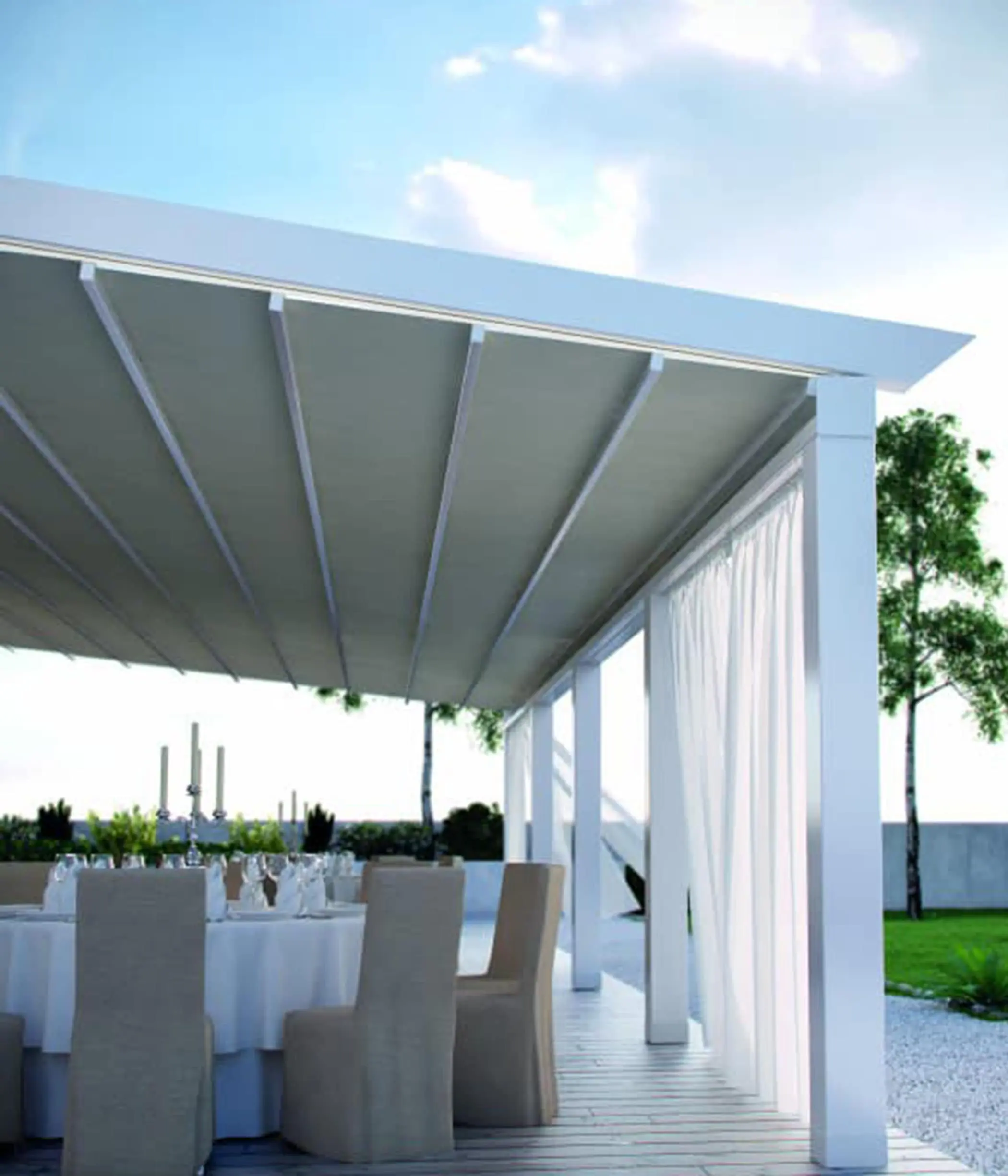 La Pergotenda con tende è una stanza all’aria aperta arricchita da tende in tessuto utili per proteggere da sole e per ottenere privacy.