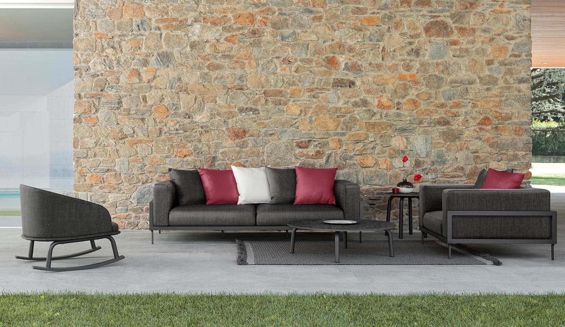 La cuscineria in tessuto sfoderabile è pensata per offrire il massimo del comfort senza compromettere la praticità: può essere facilmente lavata e resiste efficacemente agli agenti atmosferici. Un vantaggio fondamentale per l’uso outdoor intensivo.