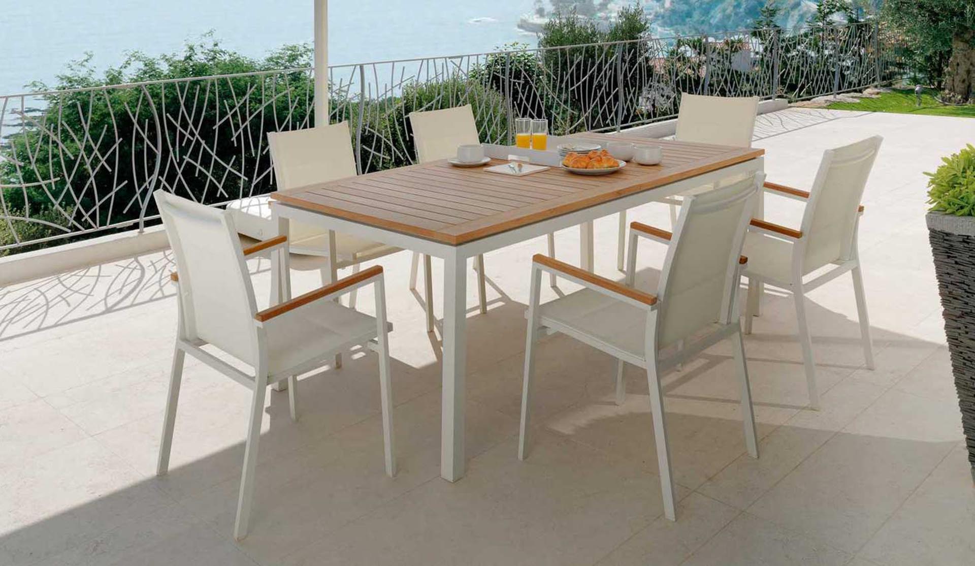 La struttura in alluminio, leggera e resistente, sostiene con eleganza la seduta e lo schienale in textilene tinta unificata, mentre i braccioli in teak, caratterizzati dalle naturali venature, creano un contrasto affascinante tra moderno e tradizionale.