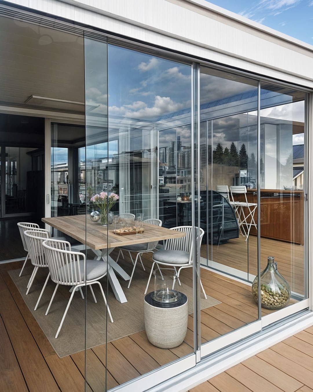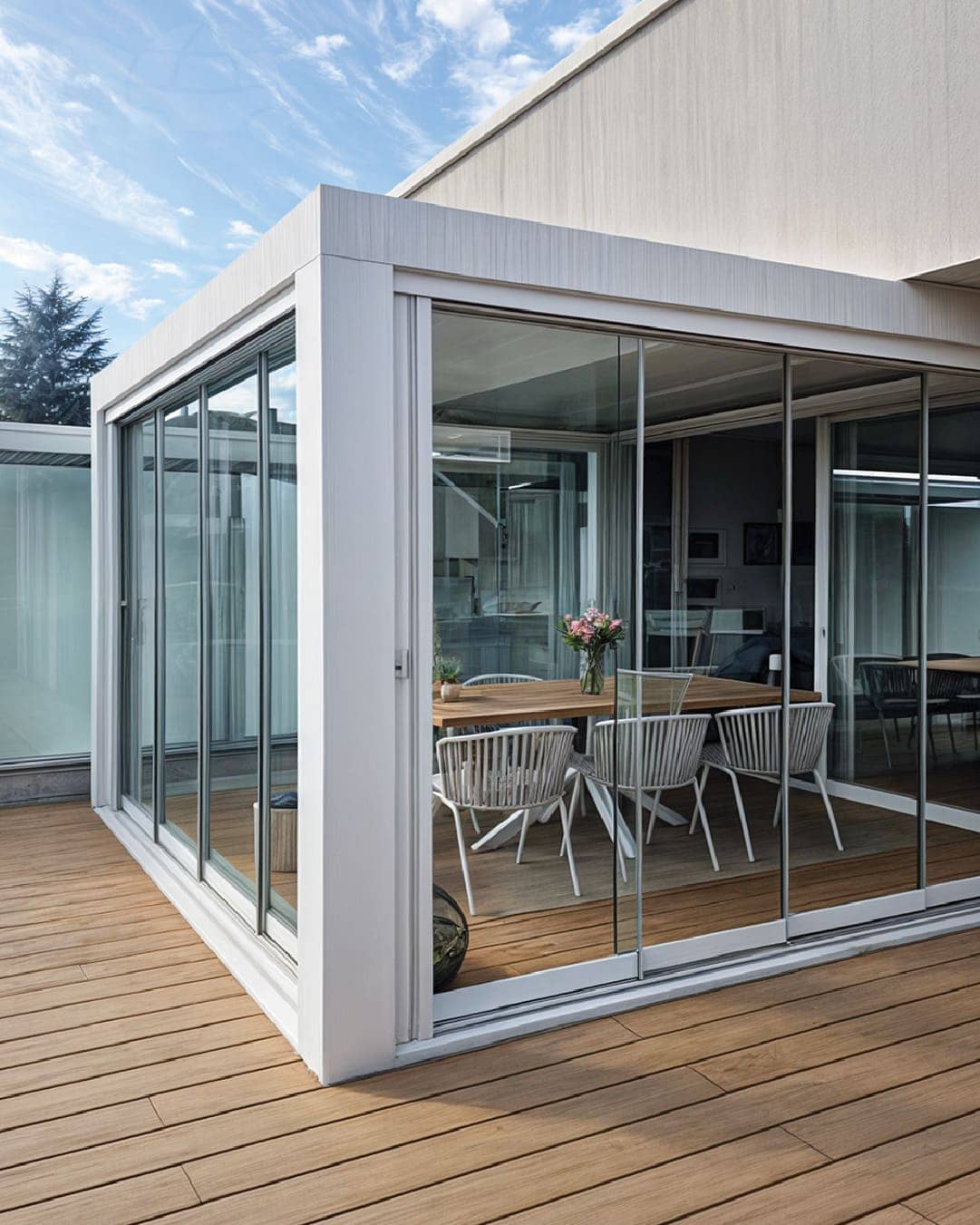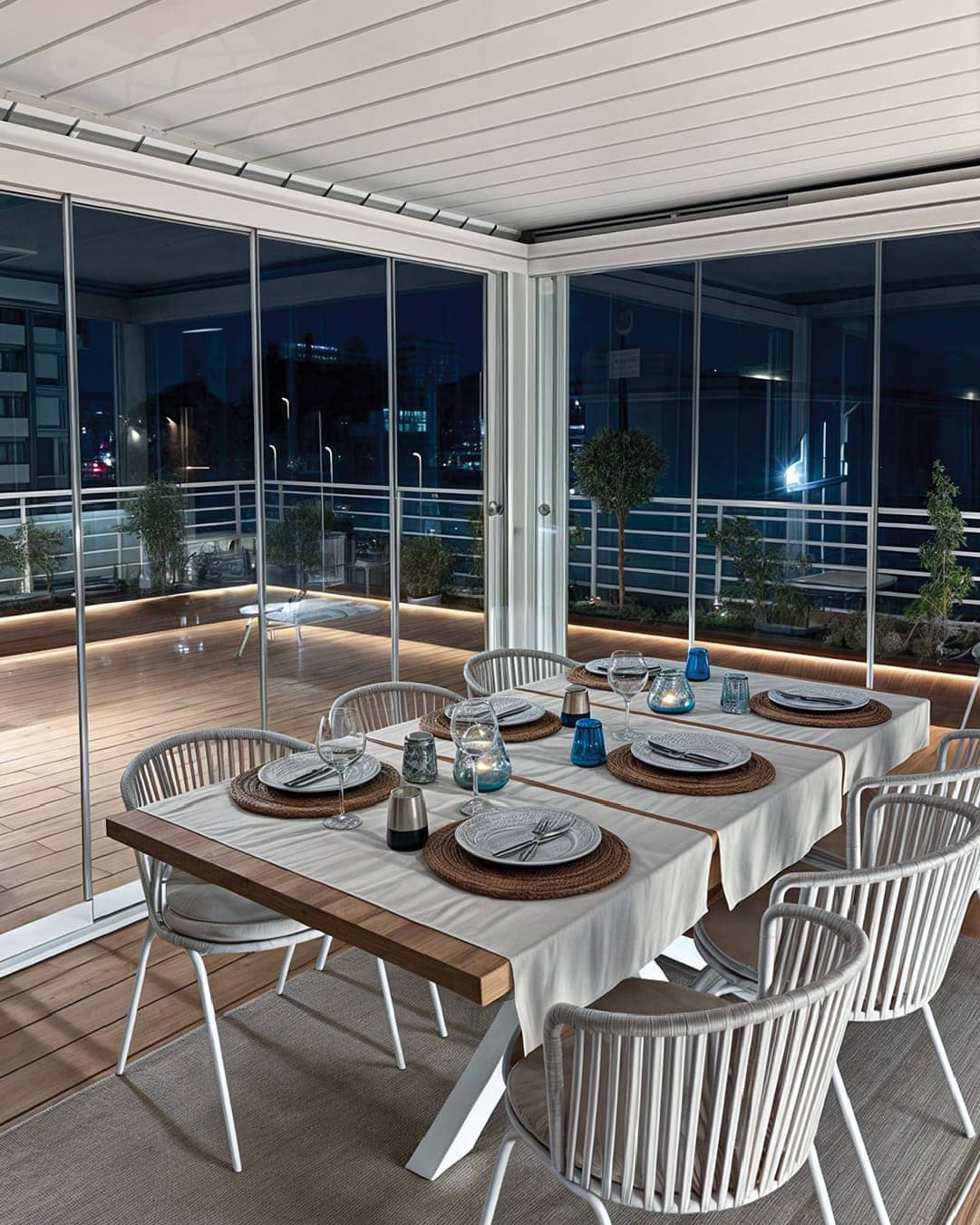 Installazione pergola bioclimatica addossata a parete con chiusure laterali tramite vetrate VEPA